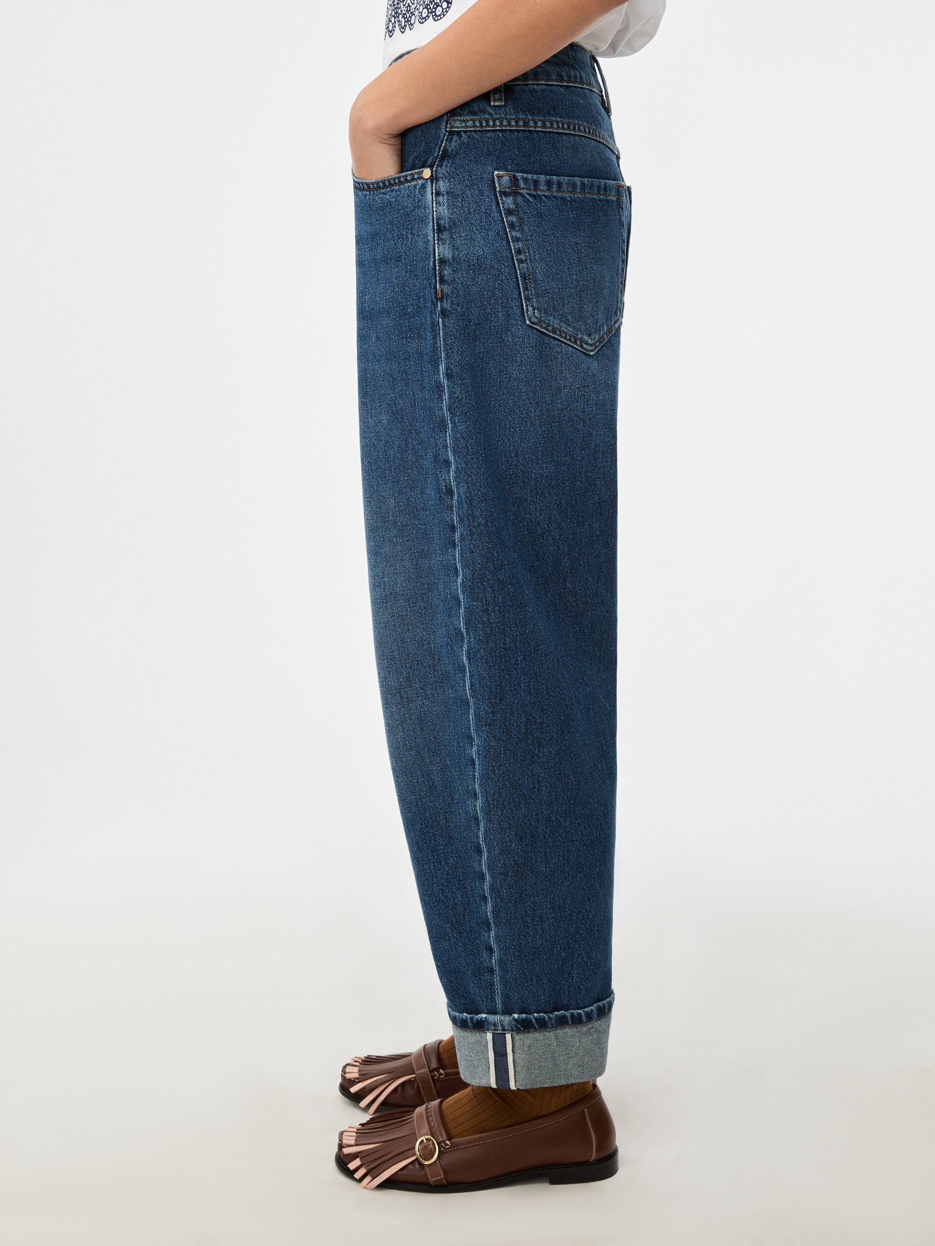- Five pockets and turned-up hem detail